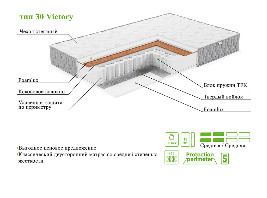 | Материал | Блок независимых пружин, Чехол, Войлок, FoamLux, Кокосовое волокно, Усиление по периметру матраса |