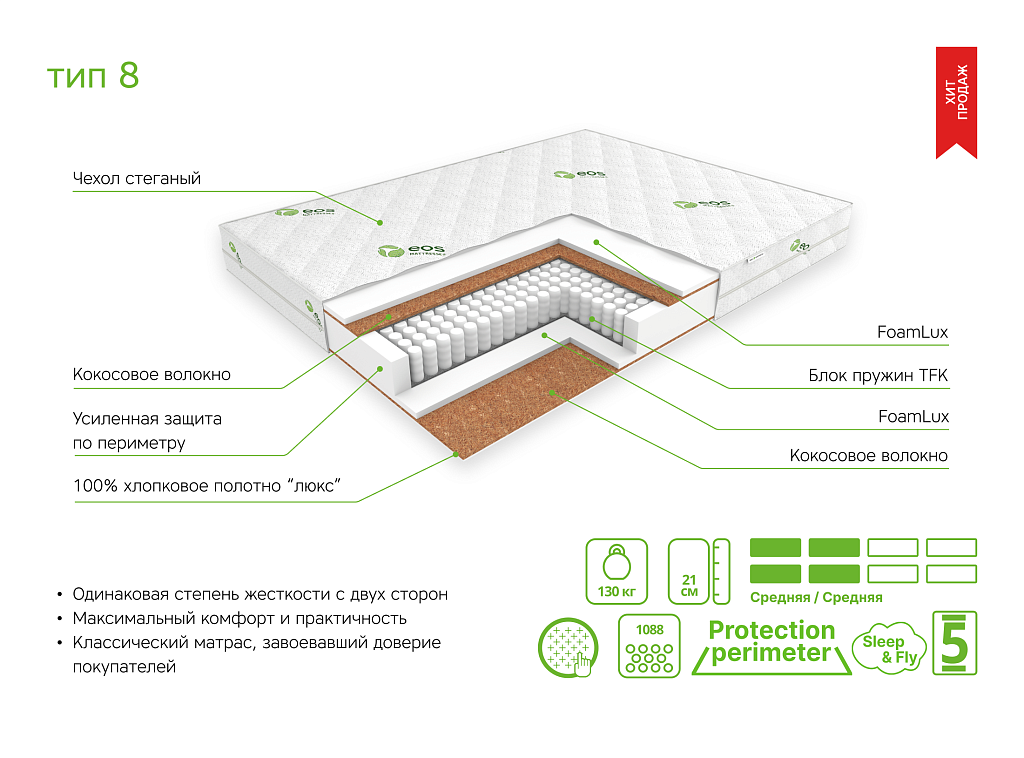 | Материал | Блок независимых пружин, Хлопковое полотно, Чехол, FoamLux, Кокосовое волокно, Усиление по периметру матраса |
