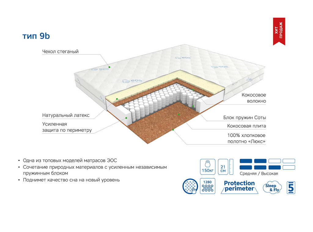 | Материал | Латекс, Блок независимых пружин, Хлопковое полотно, Чехол, Кокосовое волокно, Усиление по периметру матраса |