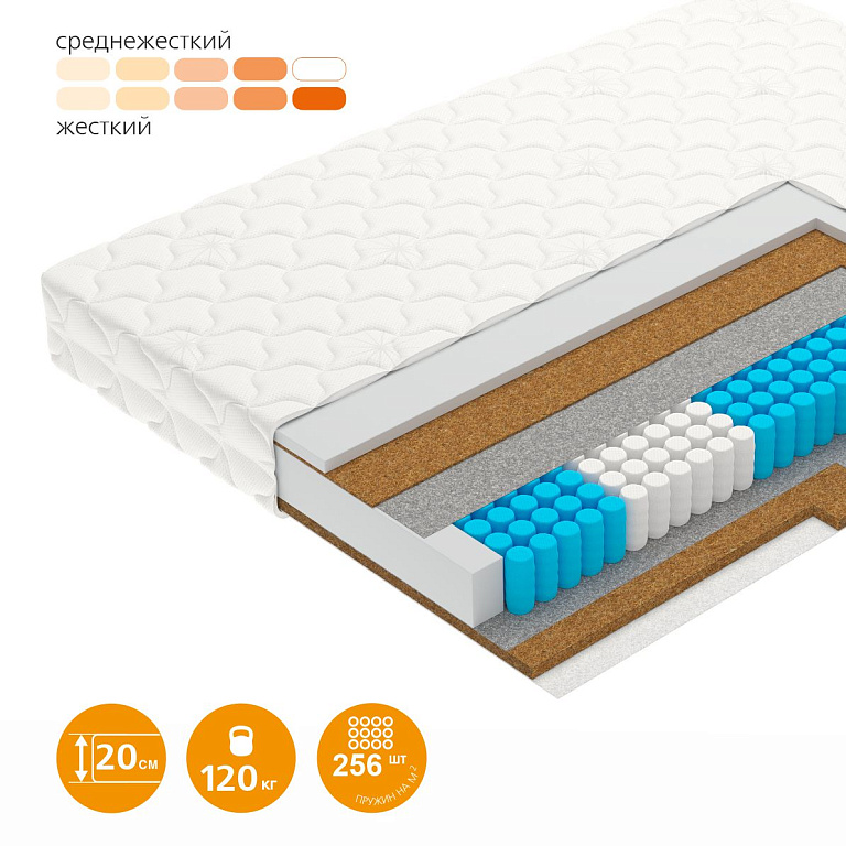 Усовершенствованный классический блок независимых пружин плотностью 256 шт/м2. Усиление ортопедического эффекта происходит благодаря пяти выраженным зонам поддержки, которые равномерно распределяют нагрузку на матрас для более комфортного и здорового сна.