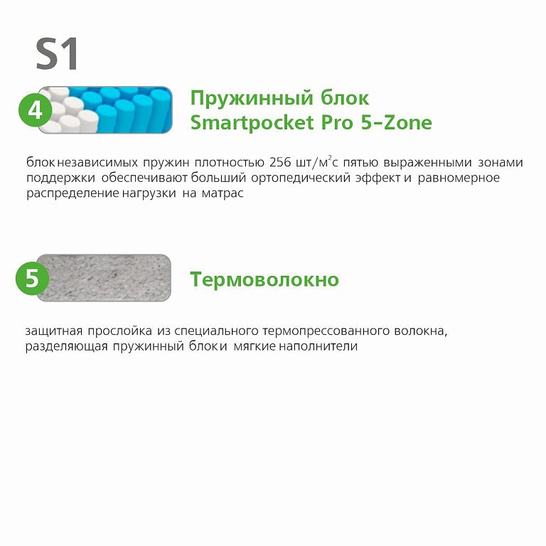 | Smartpocket PRO 5-Zone | Усовершенствованный блок независимых пружин Smartpocket плотностью размещения 256 пружин на м2. Каждая пружинка упакована в отдельный чехол и работает самостоятельно, отдельно, независимо от других пружин в блоке. Такой блок принимает форму тела спящего на матрасе - в этом и заключается ортопедический эффект. Усиление ортопедического эффекта происходит благодаря пяти выраженным зонам поддержки, которые равномерно распределяют нагрузку на матрас для более комфортного и здорового сна. |