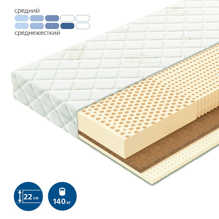 Монолит из высококачественного латекса с тремя зонами жесткости и эластичный слой из конопляных волокон Orto Hemp мягко поддерживают изгибы вашего тела. Модель с выраженным ортопедическим эффектом для ценителей природных материалов.