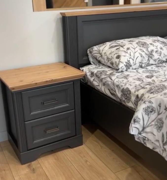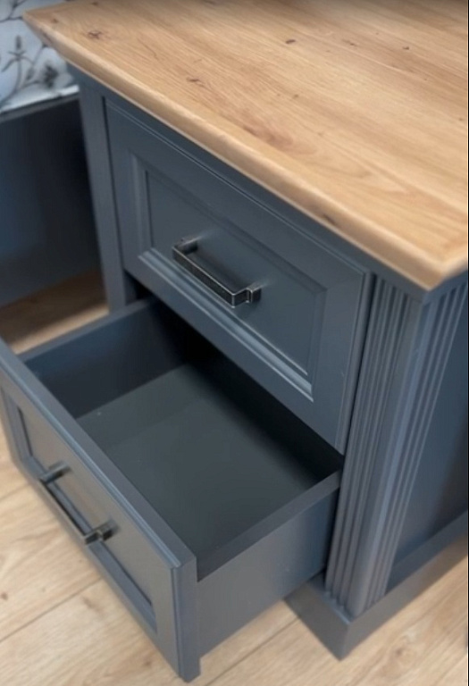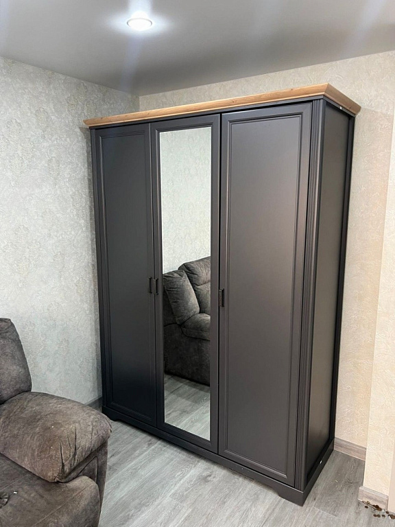 Коллекция Jasmin сочетает классику и скандинавские мотивы: столешницы с древесной текстурой, изящные гофрированные планки и металлические ручки. Графитовые фасады и фурнитура с системой плавного закрывания подчеркивают стиль «тёмный скандинавский».