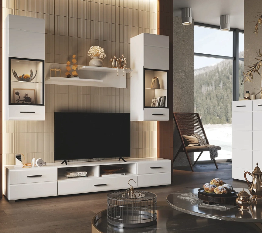Комплект характеризуется белыми глянцевыми фрезерованными поверхностями фасадов и плоскими ручками чёрного цвета.