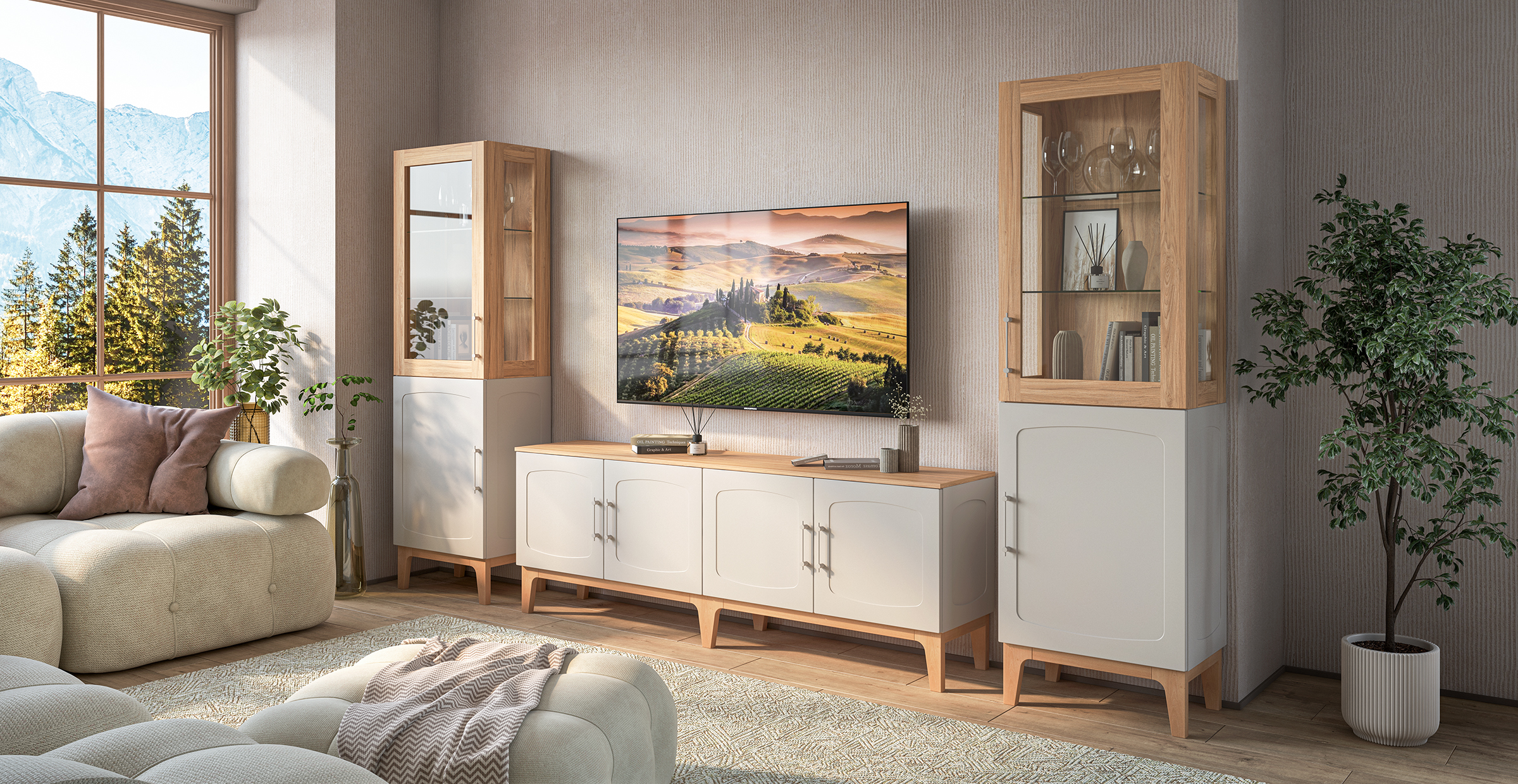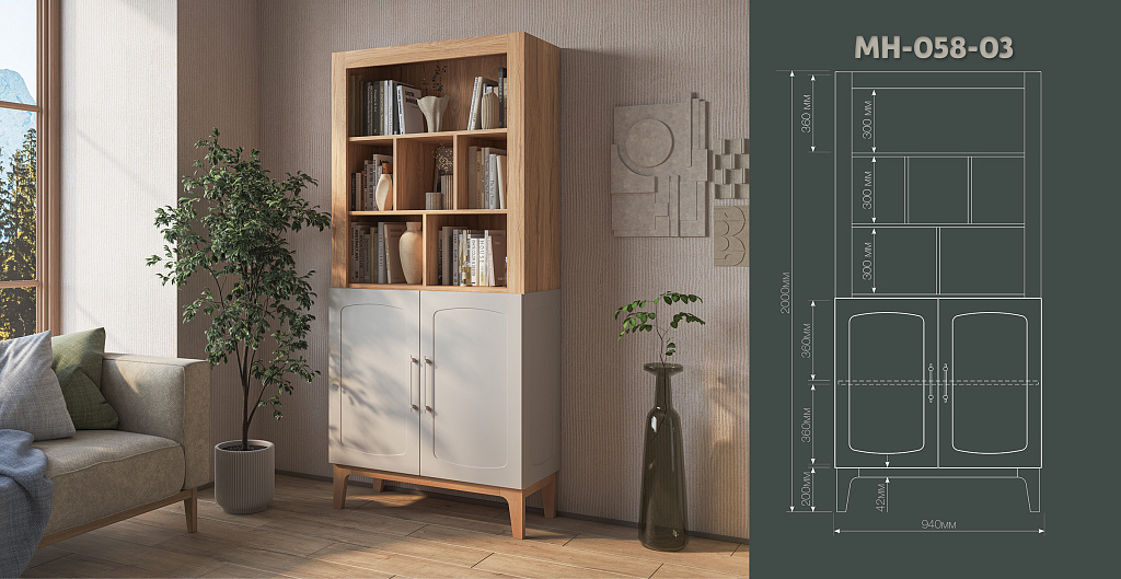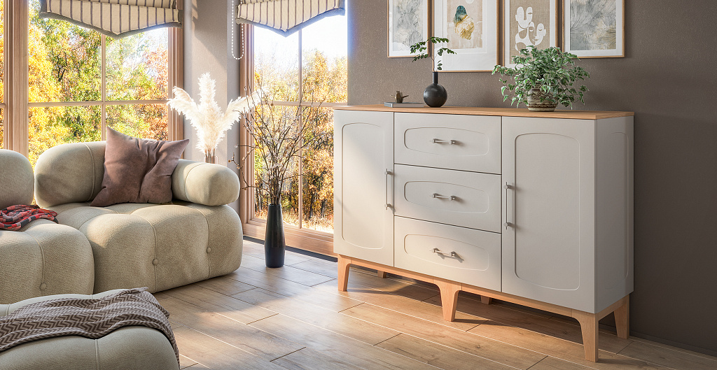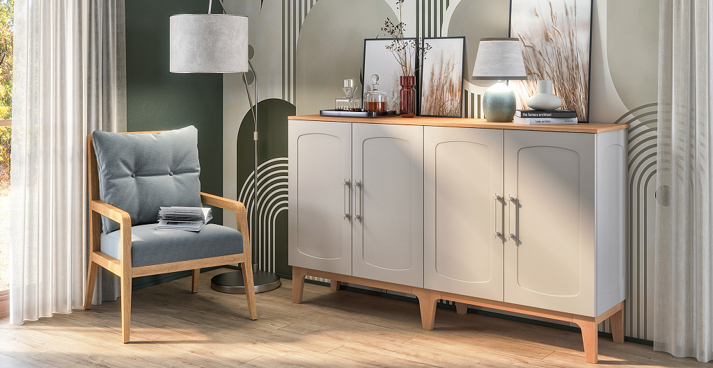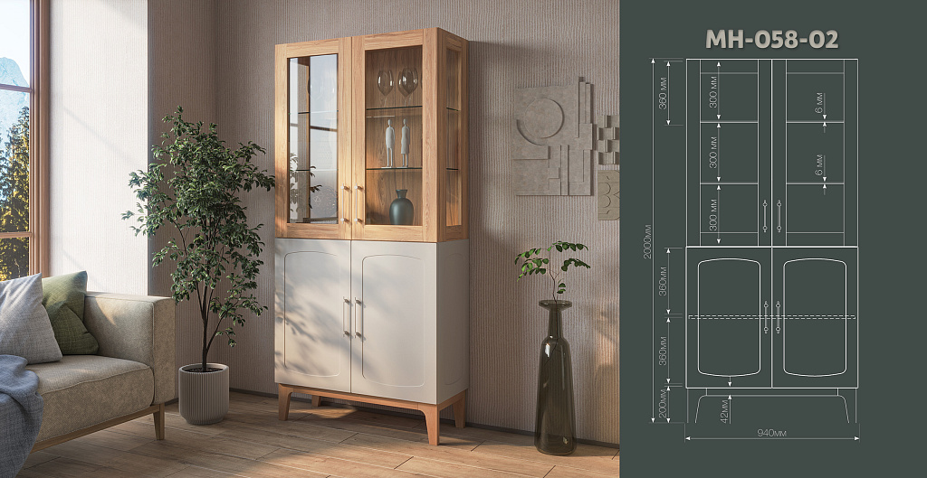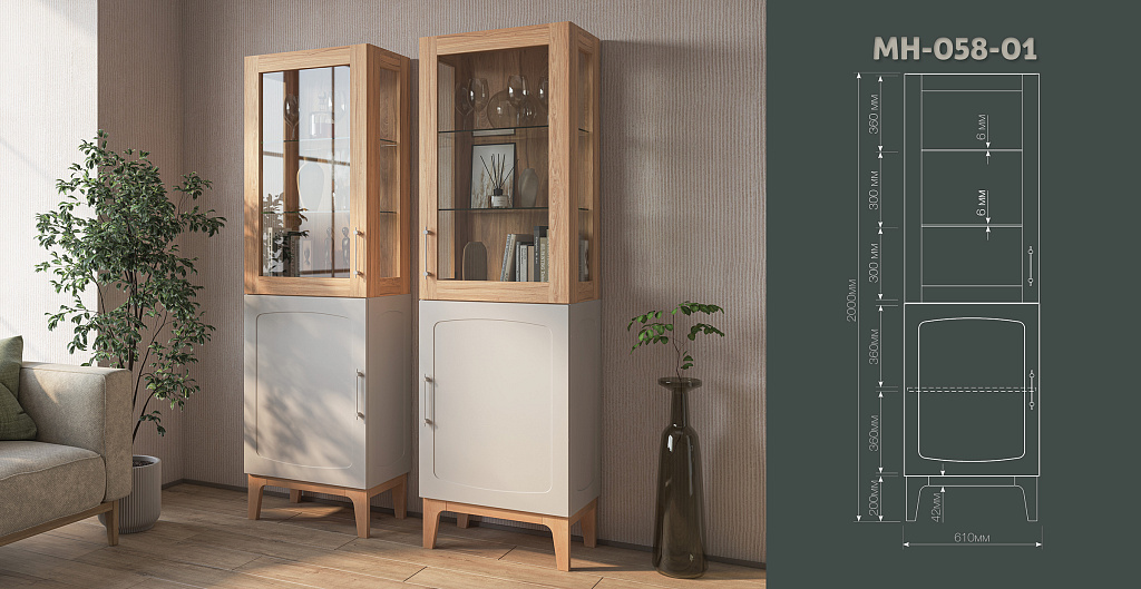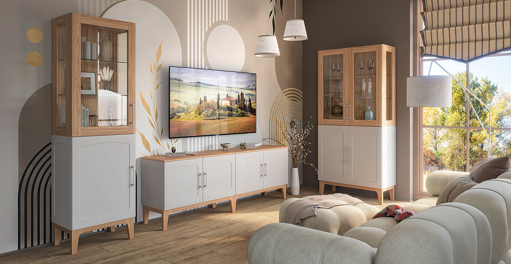 Изящные ножки из массива дерева придают композиции воздушность и визуально расширяют пространство, наполняя его светом. Инновационное матовое покрытие фасадов – это тактильное наслаждение, мягкая бархатистая поверхность, которая словно приглашает прикоснуться. Стеклянные витрины добавляют лёгкость и глубину, создавая эффект простора и ощущение порядка.