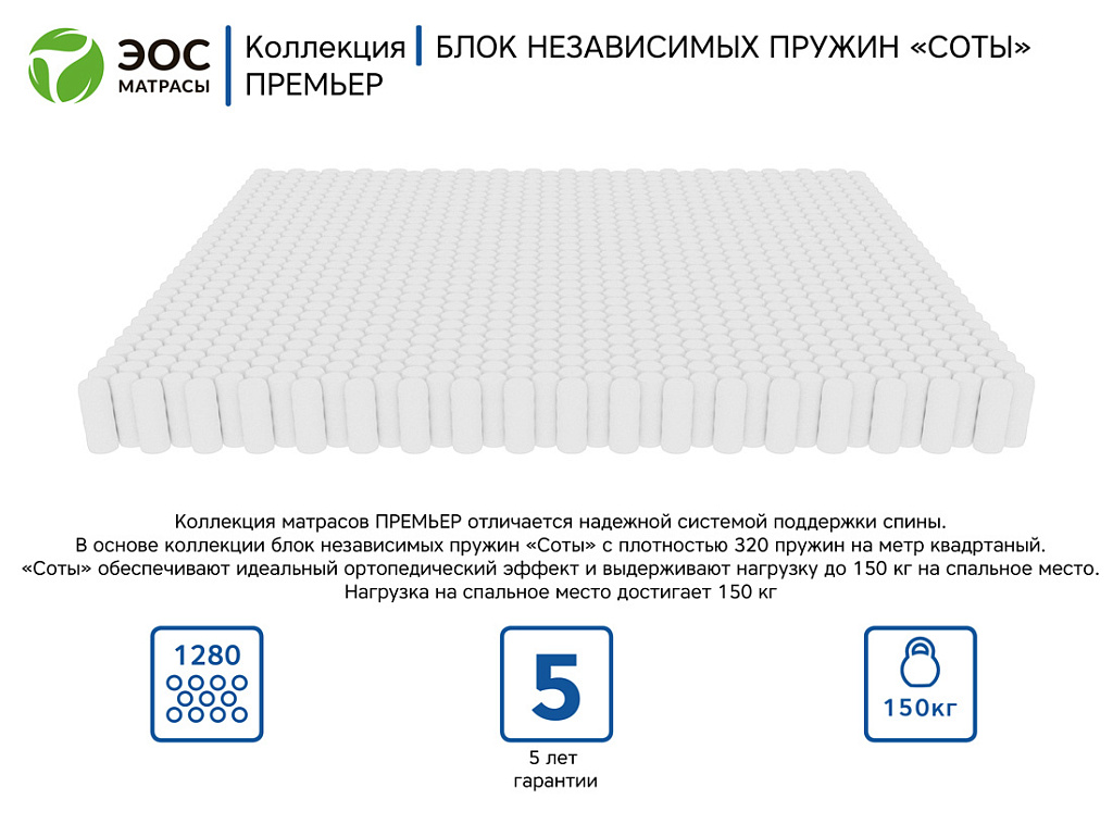 В пружинном блоке, усовершенствованное расположение пружин в виде пчелиных сот, позволяет увеличить плотность пружин до 320 пр/м2. Благодаря этому матрасы обладают исключительной устойчивостью к повышенным нагрузкам на протяжении длительного времени.