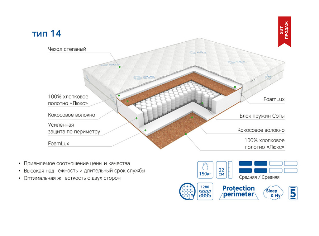 | Материал | Блок независимых пружин, Хлопковое полотно, Чехол, FoamLux, Кокосовое волокно, Усиление по периметру матраса |